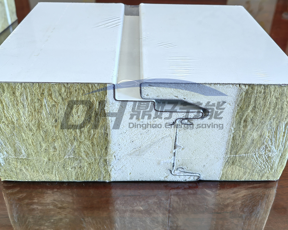 8、采用岩棉90度翻转的新型生产工艺(岩棉芯材堆密度≥120kg/m3,玻璃棉堆密度≥64kg/m3),使之与钢板成垂直状,抗压抗拉强度提高50%以上。