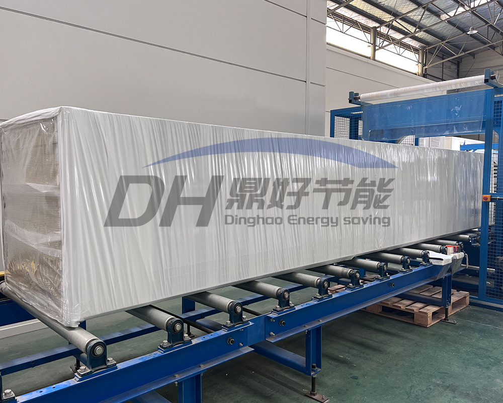 9、采用岩棉90度翻转的新型生产工艺(岩棉芯材堆密度≥120kg/m3,玻璃棉堆密度≥64kg/m3),使之与钢板成垂直状,抗压抗拉强度提高50%以上。