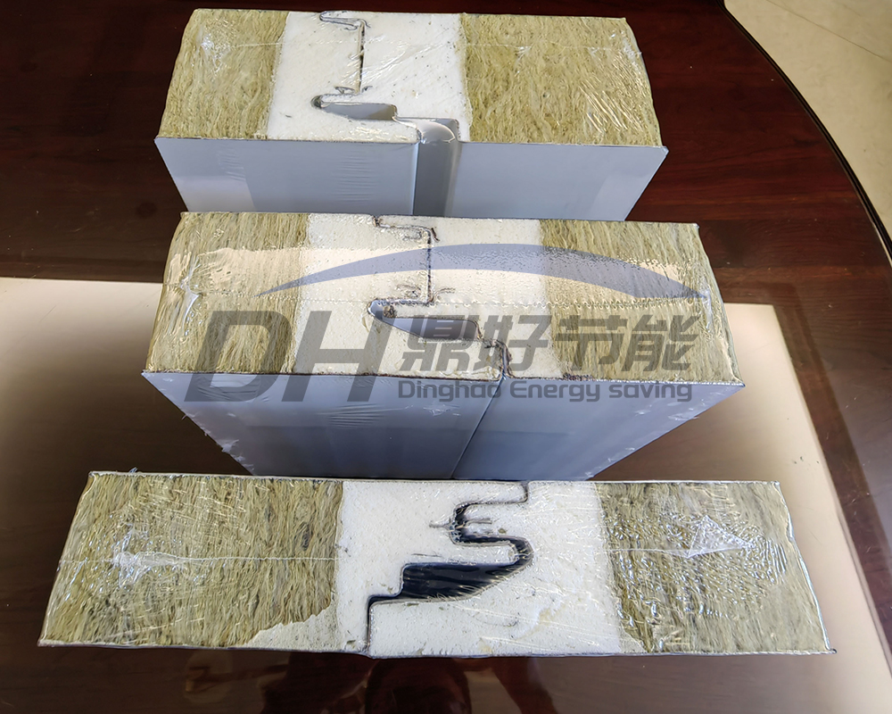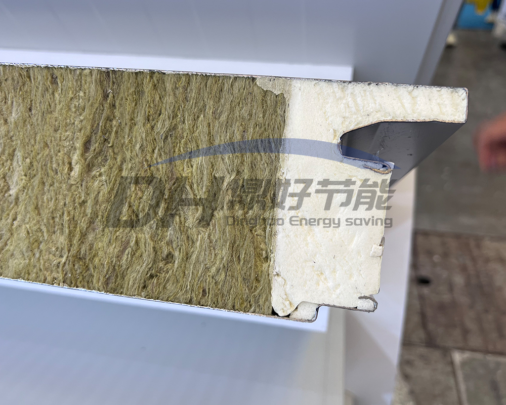 8、采用岩棉90度翻转的新型生产工艺(岩棉芯材堆密度≥120kg/m3,玻璃棉堆密度≥64kg/m3),使之与钢板成垂直状,抗压抗拉强度提高50%以上。