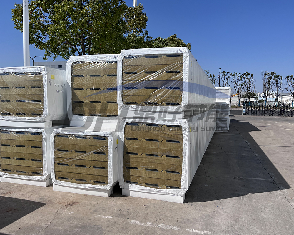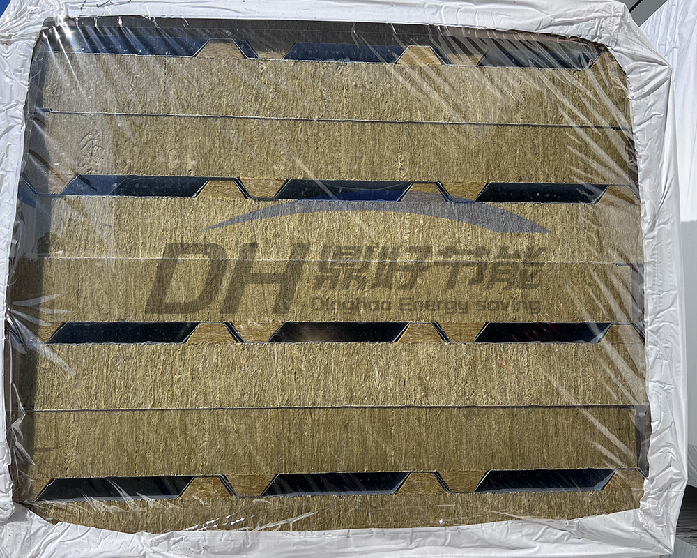 9、采用岩棉90度翻转的新型生产工艺(岩棉芯材堆密度≥120kg/m3,玻璃棉堆密度≥64kg/m3),使之与钢板成垂直状,抗压抗拉强度提高50%以上。